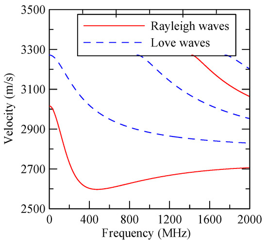 The relationship between and can be obtained from Equation (29); the dispersion equation of the N-layer semi-infinite SAWs.