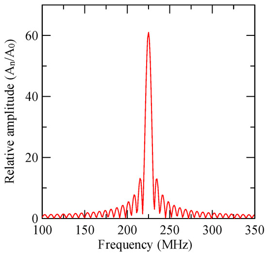 As shown in Figure 9, the observation point x = 0 is placed in the center of the IDT. Assuming that the electrode cycle is d, the pulse generated by the nth electrode and its neighboring electrodes can be regarded as the nth wave source. is its amplitude, which is proportional to the overlapping length between the electrodes. represents the electrode’s polarity, is the wave travel time from the nth electrode to the observation point, and N is the number of electrodes in the IDT. If N is an odd number, the observation point falls on the middle electrode; if N is an even number, the observation point falls between the two electrodes. Assume that N electrodes can generate N-1 pulses; then, the overall impulse response of odd electrodes is as follows: