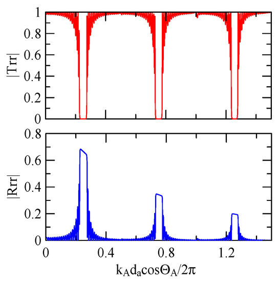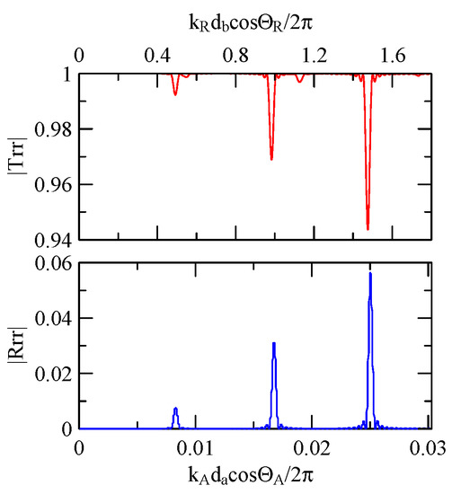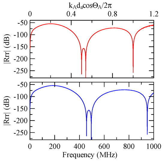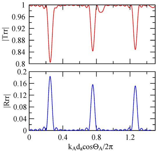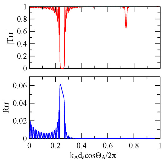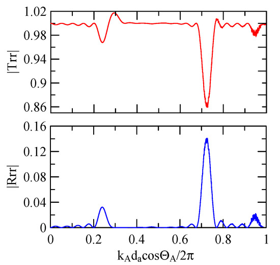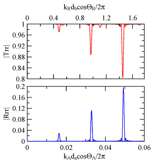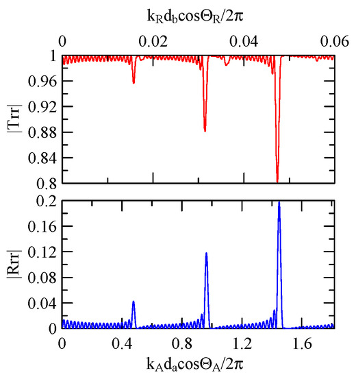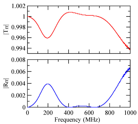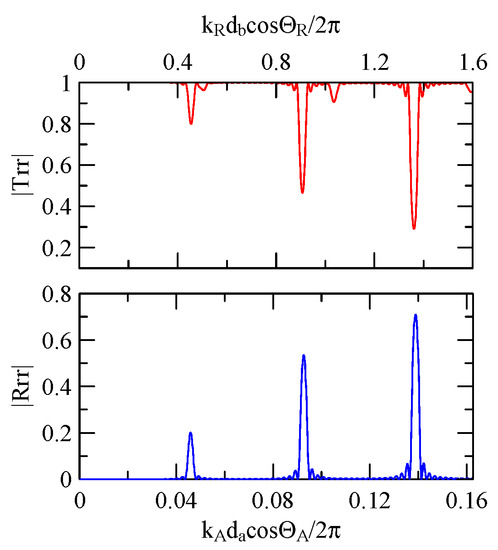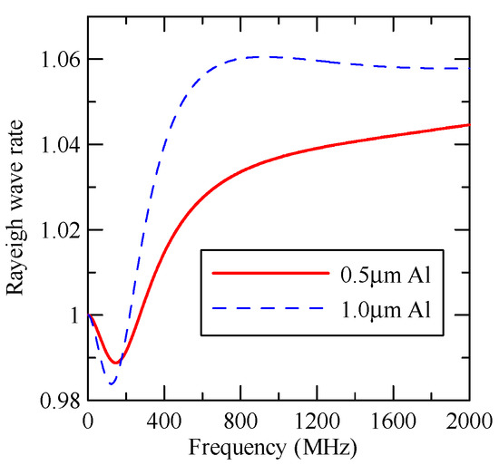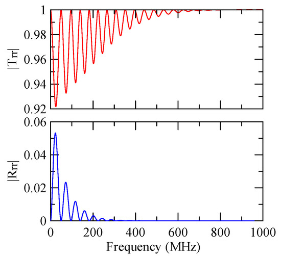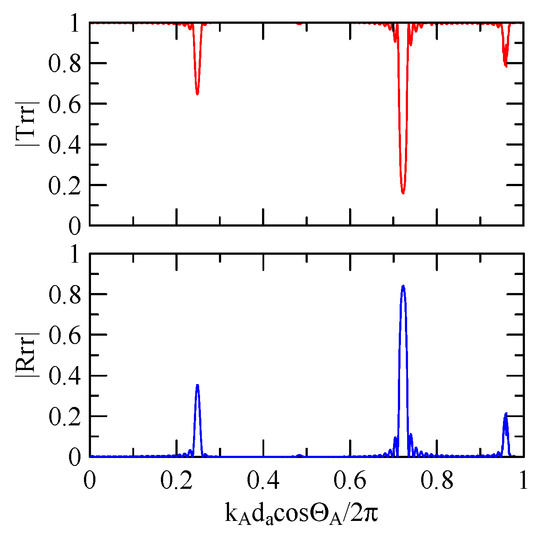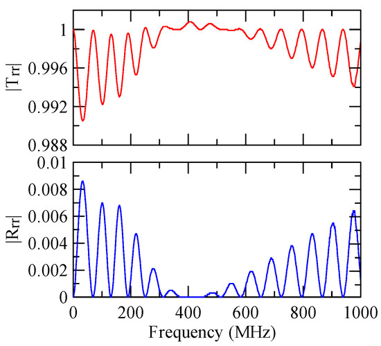 The global notch of reflectivity phenomenon can be identified around 560 MHz in Figure 40, 350 MHz in Figure 41, and 407 MHz in Figure 42, Figure 43 and Figure 44. From Figure 40 to Figure 42, alongside the different notch frequencies, the dispersion curve of the acoustic wave’s phase velocity on the surface of the layered medium also differs, representing a difference in material characteristics.