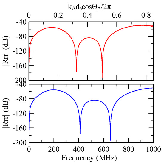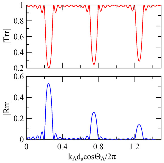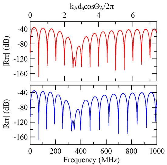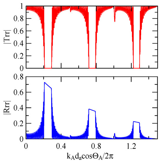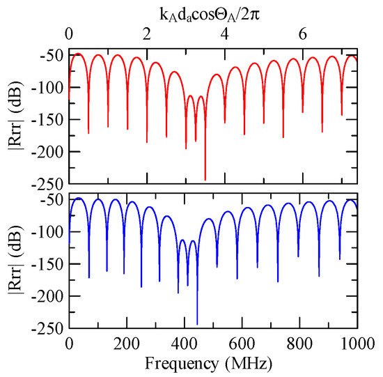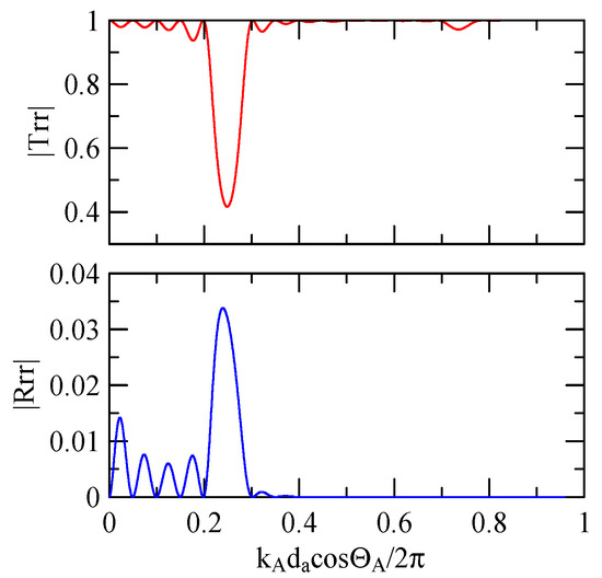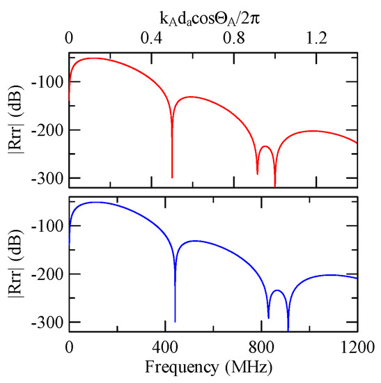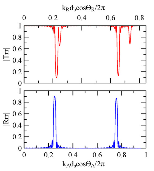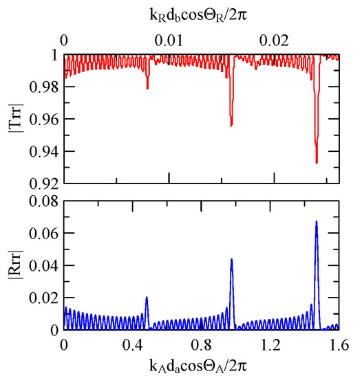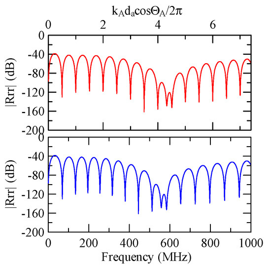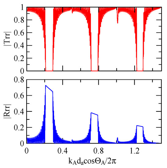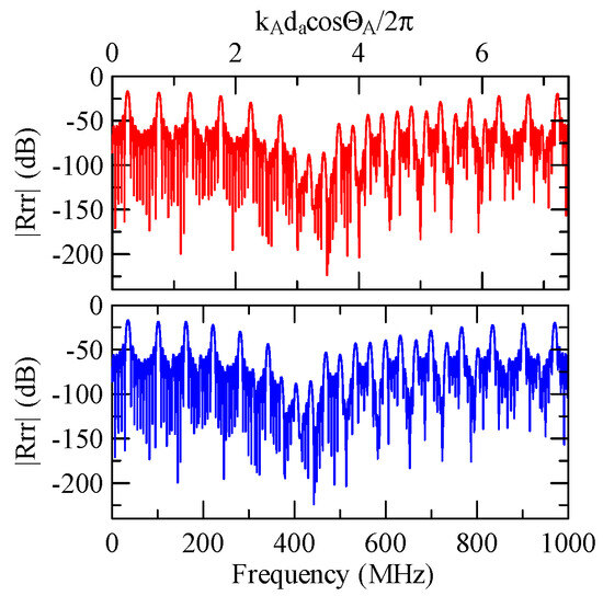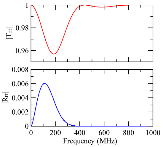 The global notch of reflectivity phenomenon can be identified around 560 MHz in Figure 40, 350 MHz in Figure 41, and 407 MHz in Figure 42, Figure 43 and Figure 44. From Figure 40 to Figure 42, alongside the different notch frequencies, the dispersion curve of the acoustic wave’s phase velocity on the surface of the layered medium also differs, representing a difference in material characteristics.