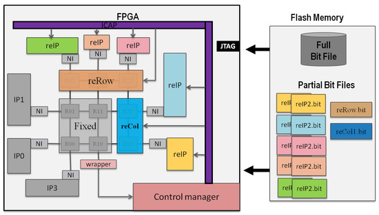 The control manager is encompassed by the three blocks, as shown in Figure 6. The first block is the IP’s status control manager responsible for IP status control, and the second block refers to the router’s status control manager. The third block is responsible for handling the partial reconfiguration process by loading the correct bitstream into the corresponding reconfigurable region.