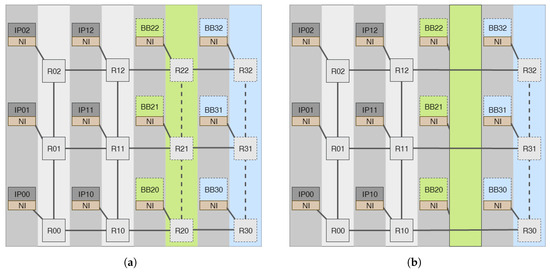Column-wise scalable 4 × 4 NoC with dynamic behavior. (a) State of all routers used. (b) State of links replacing the routers in green column.