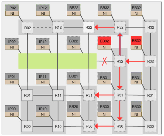 It will be the same case when a sub-row is replaced by a direct link, as shown in Figure 5 in the green area. If either router or wants to send packets to routers below or above the green region using the traditional XY routing algorithm, the packets will stack at the output west port of router . The solution is to use the XYX routing algorithm. For example, if the IP connected to router wants to send packets to the IP connected to router , the packets have to follow to arrive at the destination.