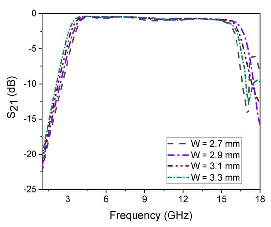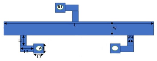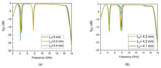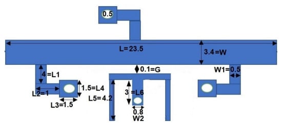 It has the advantage that both stopbands can be controlled by the users, according to their application, based on the stubs’ length. For example, as shown in Figure 9a, the first stopband can be controlled using the central shorted stub with dimensions of L6 = 3 mm, and by changing the dimension, only the first stopband moves down, while the second band is stable. Similarly, from Figure 9b, the second stopband can be controlled by the outer half-wavelength stubs with dimensions of L5 = 4.2 mm, and by changing the dimension, only the second stopband changes while the first band is stable. So, this makes the proposed filter capable of stopping any frequency, according to the user’s applications.