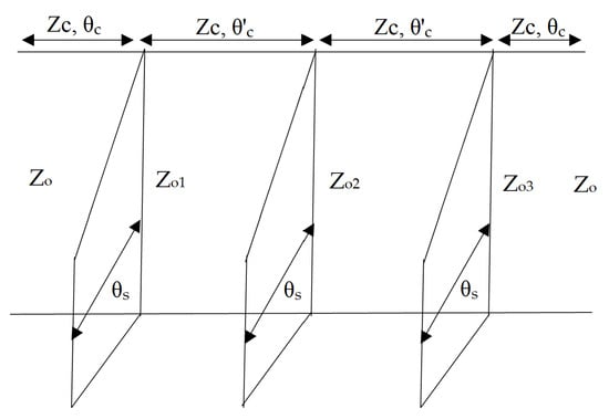 Figure 1 depicts the SWB-BPF architectural layout. It is made up of a UTL that has three-quarter wavelength stubs loaded onto it; one of these stubs is attached to the upper portion of the UTL, and the other two are positioned symmetrically on the lower portion. The SWB-BPF has been investigated by considering a lossless transmission line, and ignores the effect of inductance and capacitance at short-circuited stubs and at the edges of the junctions, which appears due to the step discontinuities. The equivalent configuration of the initial prototype is shown in Figure 2. Z1, Z2, and Z3 represent the characteristic impedances of the shorted stubs with electrical length of θs, separated with connecting lines of electrical lengths of θc = 2θs. All impedances (Z1 = Z2 = Z3) should be equal for design simplicity. The following steps are used to achieve the extreme broadband response. At first, the resonator with open- or short-circuited stubs, as shown in Figure 3a,b, is connected in the middle of the UTL.