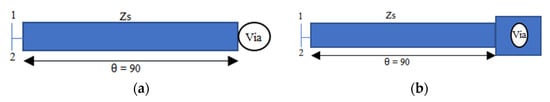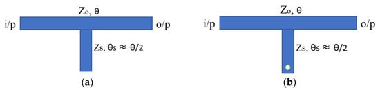 Equation (10) determines the resonant electrical lengths (θ) for the other component, which relies on the stub parameters. The same analysis can also be used for Figure 3b. In this case, Equation (9) remains unchanged, while Equation (10) becomes