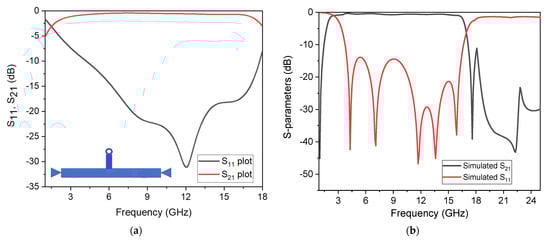 The stubs depicted in Figure 3a,b have been substituted with the stubs illustrated in Figure 4a,b. Initially, a conventional stub, as depicted in Figure 4a, was positioned at the centre of the UTL using matrix Equation (11) []. The given configuration generates a wideband response with poor selectivity, with one TP observed at 12 GHz, as depicted in Figure 5a.