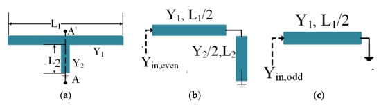 In this section, the dual-notch characteristics using a short-circuited, T-shaped, dual-mode resonator are achieved. A symmetrical quarter-wavelength resonator is used instead of a half-wavelength resonator to make the structure compact, as shown in Figure 6. To analyse the behaviour of the structure, the design utilizes a classical method called even–odd mode analysis. This involves separating the circuit into its even and odd modes and analysing each mode separately. This method helps to predict the controllable operating bands of the filter. The even mode will have a symmetric current distribution and can be represented by even terms in the analysis, as shown in Figure 6b, while the odd mode will have an anti-symmetric current distribution and can be represented by odd terms, as shown in Figure 6c, respectively. By applying this analysis and using the basic concept of microwave transmission lines, the equations of the characteristic input admittance of each resonator can be derived, taking into account the lengths of the half-wavelength line (Y1, L1) and quarter-wavelength line (Y2, L2), with a load admittance (YL) [,].