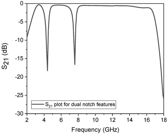 In this study, the SWB BPF with stopband characteristics was designed and implemented. The SUWB-BPF is made up of a UTL that has three-quarter-wavelength stubs loaded onto it; one of these stubs is placed on one upper side of the UTL and the other is positioned symmetrically on the other side to achieve high sharpness in the filter and a flat passband response. A Rogers RO-4350 dielectric substrate with a low tangent loss of 0.0003, h = 1.5 mm, and ϵr = 3.6 was selected for the fabrication of the prototype to make the passband IL as low as possible, i.e., less than 0.4 dB, which leads to a flat group delay without ripples appearing in the passband. The structure was studied by considering a lossless transmission line and was investigated through the ABCD matrix. The replacement of conventional stubs with three new folded shunt stubs with pads enhances the filter’s performance in terms of its wide bandwidth, high selectivity, and multiple TPs. In the second step, two notches were created using a shorted, T-shaped resonator, coupled with the initial wideband filter, and analysed using a method called even–odd mode analysis. Two controllable stopbands were achieved for the application of long-distance wireless ISPs (WISPs), centred at 4.4 GHz, and X-band communication centred at 7.5 GHz. The first 4.4 GHz stopband was created due to the equivalent circuit shown in Figure 6b, while the second 7.5 GHz stopband was achieved due to the equivalent circuit shown in Figure 6c. The simulated response of the dual stopband filter is depicted in Figure 8.
