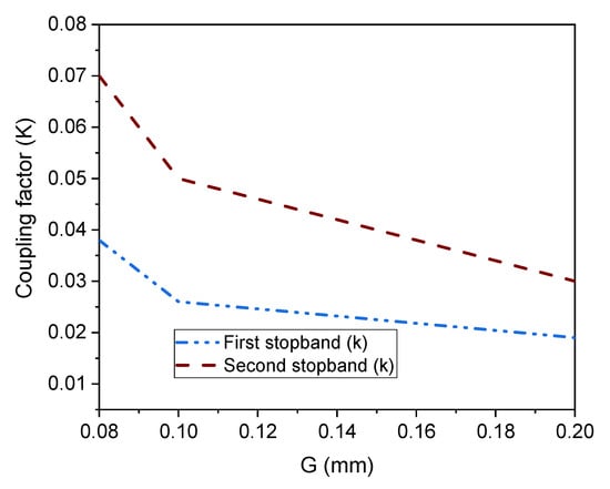 Another important phenomenon that needs to be discussed is the coupling coefficient (k) that appears when two or more resonators come in close contact []. As shown in Figure 7, the coupling phenomena originate based on the gap (G), which is given in Equation (22). As depicted in Figure 10, the “K” drops when the gap is increased from 0.08 mm to 0.2 mm, or vice versa.