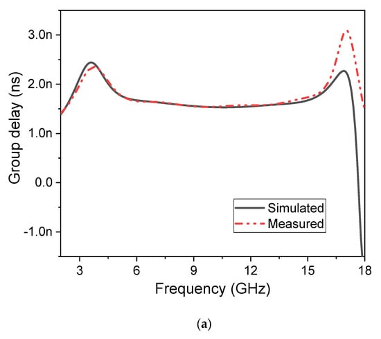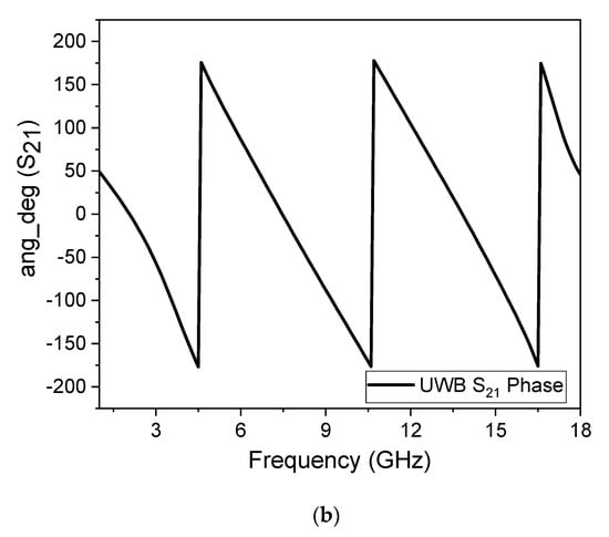 The terms φ21 and τd in the equations above stand for the parameter phase and group delay, relative to the magnitude (S21). As shown in Figure 11a, the group delay is practically flat across the full passband, ensuring that all current flows with the same velocity and phase, resulting in the minimum amount of frequency dispersion possible. Also shown in Figure 11b is the suggested UWB filter’s phase response.