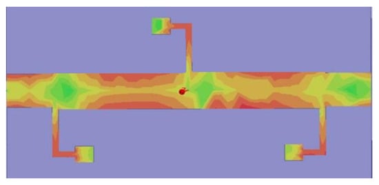 The distribution of currents in the passband, which is utilized to confirm the resonant behaviour of the ultra-wideband filter, is another important hypothesis that should be explained. The simulated current distributions at a centre frequency of 9.65 GHz are shown in Figure 12. As discussed, the wideband filter is constructed on the UTL with three folded λ/4 shunt stubs, as shown in Figure 1; therefore, it is expected that most of the current energy will be absorbed by this portion of the filter. This absorption of current energy by the UTL and stubs contributes to the creation of the passband in the filter.