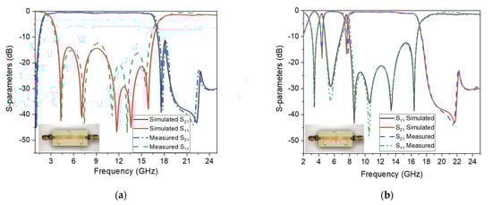 Simulated and measured S11 and S21 frequency plots. (a) The proposed SWB BPF. (b) The proposed SWB BPF with dual stopbands.