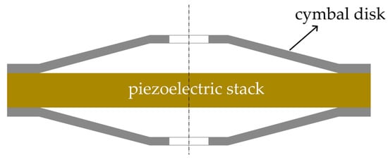 As shown in Figure 1, the stacked cymbal vibrator is composed of a piezoelectric stack and two cymbal disks. The circular piezoelectric stack is installed in the middle of the cymbal vibrator. The lower edge of the cymbal disk is bonded to the stack, while a small hole is introduced at the top of the cymbal disk to maintain air pressure balance and reduce noise [43].