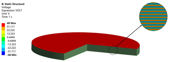 Figure 4 shows the displacements of the structure in the radial direction with a maximum value of 3.2 μm in (a); while the displacement in the thickness direction has a maximum value of 0.89 μm in (b). It can be noted that the radial displacement is one order of magnitude greater than the longitudinal displacement. If the radial displacement is transformed and amplified into a longitudinal displacement, a larger longitudinal displacement can be obtained. The electric potential distribution of the piezoelectric stack is shown in Figure 5. Each piezoelectric layer has an electric potential gradient and is therefore subjected to an electric field.