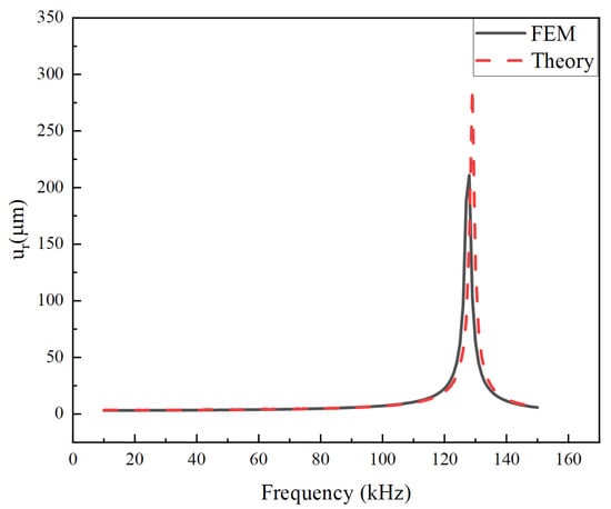 The harmonic analysis is performed by using the harmonic response module in Workbench with the full method. The global damping is set to 0.01. The boundary conditions are the same as for the static analysis. A sinusoidal voltage is applied in a certain frequency range. Figure 6 shows the radial displacement response of the stack in the frequency range from 10 kHz to 150 kHz under an 80 V voltage, calculated by theory and simulation, respectively. In order to correspond to the finite element calculation, the same material damping η = 0.01 is taken in the theoretical calculation [44]. As can be seen from the figure, the theoretical results agree well with the simulation values in the resonance region. The structure exhibits a resonance frequency of around 130 kHz. Figure 7 shows the comparison results of the longitudinal displacement under the same conditions. The resonance frequencies predicted by the two methods are very close, which mutually verifies the correctness of the calculation results. However, amplitudes do not match well at the resonant frequency. The phenomenon mainly stems from the difference between these two models. The theoretical model is an axisymmetric model that meets Equation (2). Therefore, the circumferential displacement is assumed to be 0. However, the finite element model is a three-dimensional model with circumferential displacement not equal to 0. Therefore, circumferential displacement affects radial displacement and thickness direction displacement, especially around the fundamental frequency of the piezoelectric stack. Fortunately, the operating frequency is much lower than the fundamental frequency.