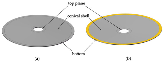 As illustrated in Figure 8, the boundary conditions are applied at the bottom, represented by the color yellow: displacement in the z direction is set to zero, i.e., uz(L) = 0, and excitation by radial displacement . Equation (35) gives the expressions of and . As a free end, the top of the cymbal disk has the boundary conditions: Ns(0) = Ms(0) = Qs(0). Equation (36) is obtained from the corresponding boundary conditions at the top and bottom of the cymbal disk.