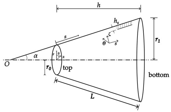 As shown in Figure 8, the cymbal disk consists of a top plane, a conical shell, and a bottom. The cymbal disk has a small hole at the top. The air fills the cavity formed by the cymbal disk and piezoelectric ceramics. But due to the presence of the hole, we neglect the effect of air pressure. Because the displacement amplification effect is generated by the conical shell, while the other two parts have little impact on the amplification, the investigation is focused on the conical shell. The conical shell model and coordinate systems are shown in Figure 9. Unless otherwise stated, the material and specific dimensions are listed in Table 2.