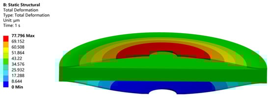 For the boundary conditions of the overall finite element model of the overall vibrator, the bottom is fixed and the top is free. Furthermore, interfaces between the cymbal and the stack are set as binding contacts. The electrical boundary conditions are illustrated in Figure 2. A static analysis of the overall model is performed. Radial and longitudinal displacements of the overall vibrator under different voltages are obtained. Similarly, harmonic response analysis is also performed to obtain the displacement response of the vibrator at different frequencies. Figure 11 shows the longitudinal displacement response of the vibrator when excitation of voltage 80 V under static analysis. The maximum longitudinal displacement is 77.796 μm.