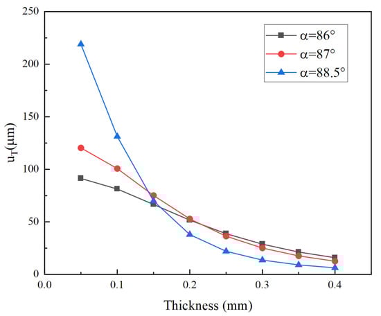 Figure 14 shows the effect of the thickness of the cymbal disks on the total longitudinal displacement of the vibrator at different angles. It can be noted that the thicker the cymbal disk, the smaller the total longitudinal displacement. It is because the stiffness of the cymbal increases with increasing thickness. The deformation then decreases under the same force. Furthermore, for a thin cymbal with a thickness less than 0.2 mm, the larger the inclination angle, the greater the impact of thickness on the total longitudinal displacement.