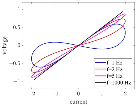 where and represent constants related to memristors. Generally, . In this study, we set as . For the discrete memristor model described above, when a sinusoidal excitation signal is applied, one can observe a pinched hysteresis loop of the memristor, as depicted in Figure 1. As one can see, when the frequency f of sinusoidal signal increases, the memristor’s pinched hysteresis loop becomes narrower. As f tends toward infinity, the pinched hysteresis loop contracts into a straight line. These characteristics demonstrate that our adopted discrete memristor model satisfies the definition of a memristor.