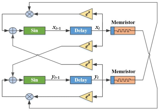 In our study, this discrete memristor model is exploited to enhance the chaotic and complex properties of a 2D polynomial map. The coupling schematic diagram for the 2D polynomial map and two memristors is shown in Figure 2.