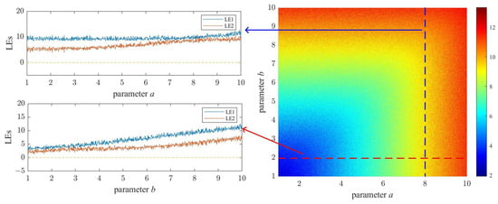 In related research on chaotic systems, the Lyapunov exponent (LE) is commonly utilized to assess the chaotic characteristics of such systems. A system is considered chaotic if it possesses one or more positive LEs. Furthermore, if a system exhibits two or more positive LEs, it signifies that the system is a hyper-chaotic system. Figure 3 shows the LE diagram of the 2D-MPHM. The LEs of the 2D-MPHM were calculated using the QR decomposition method []. Both parameters a and b were scanned from 1 to 10 with a step size of 0.01.