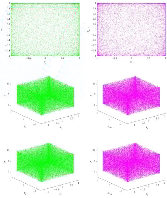 Bifurcation diagrams are commonly utilized to illustrate the chaotic behaviors of a system, enabling us to visually determine whether the system is in a state of chaos. To plot a bifurcation diagram, one or two specific control parameters of the system are examined, and the corresponding state values are calculated iteratively and presented on the diagram. If the state values exhibit a linear distribution, it indicates that the system is in a periodic state. Conversely, if the state values take on a planar distribution, it indicates that the system is in a chaotic state. Figure 4 presents the bifurcation diagrams of the 2D-MPHM that were obtained under three distinct conditions. These diagrams encompass the bifurcation diagram for the variable parameter and the bifurcation diagram for the variable parameter , as well as the 3D bifurcation diagram when both a and b are variable parameters.