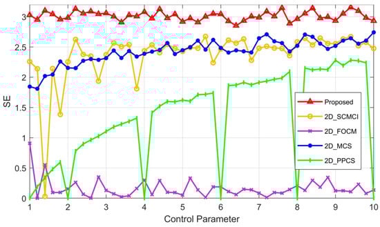 Sample entropy (SE) characterizes the complexity of a time series by measuring the probability of generating new patterns in the signal. A higher probability of generating new patterns indicates a higher level of sequence complexity. For the chaotic sequence generated by a chaotic system, we can evaluate its complexity by calculating its SE. If the obtained SE value is large, it indicates that the self-similarity of the sequence is low and the complexity is high. We calculated the SE value of the chaotic sequence generated by the 2D-MPHM and compared it with those of four other newly reported chaotic maps. Figure 6 demonstrates the pertinent test results. As we can see, the SE values achieved by the 2D-MPHM are significantly higher than those of 2D-SCMCI [], 2D-FOCM [], 2D-MCS [], and 2D-PPCS []. This indicates that when compared to these recent chaotic maps, the 2D-MPHM holds considerable advantages in terms of chaotic complexity.