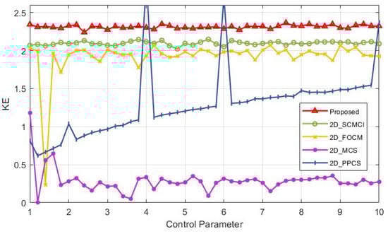 Like SE, Kolmogorov entropy (KE) is often used by researchers to evaluate the chaotic properties of a system. Generally, the larger the KE value of a system, the higher the unpredictability and complexity of the system. Figure 7 shows the KE values of the 2D-MPHM and its comparison with those of the other four 2D chaotic maps. It can be seen from the figure that the 2D-MPHM has the highest KE value in most parameter ranges, and is stable at around 2.3. The results show that the 2D-MPHM has stable and excellent chaotic complexity.