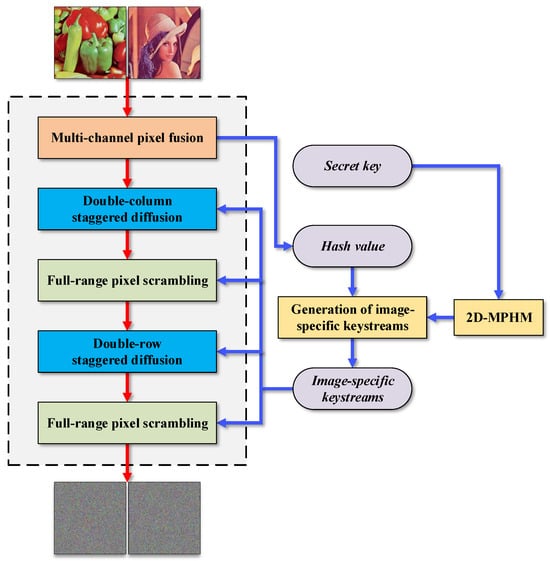 To highlight the 2D-MPHM’s superiority in engineering applications and improve the security and efficiency of image encryption, we developed a highly efficient multi-channel image encryption algorithm called an MIEA-MPHM based on the 2D-MPHM. This encryption algorithm consists of seven encryption steps, namely the generation of an initial chaotic sequence, multi-channel pixel fusion, generation of image-specific keystreams, and two rounds of double-vector (column or row) staggered diffusion and full-range pixel scrambling. Figure 8 depicts the encryption process of the MIEA-MPHM. In the subsequent subsections, we will provide a comprehensive explanation of the entire encryption process for the MIEA-MPHM.