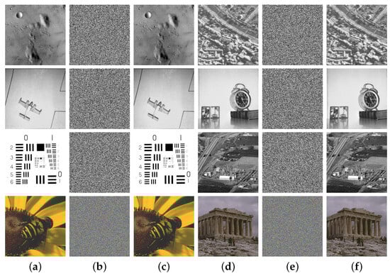 Visual effects of encryption and decryption: (a,d): six grayscale images and two color images; (b,e) encrypted ones generated by MIEA-MPHM; (c,f) decrypted ones generated by MIEA-MPHM.