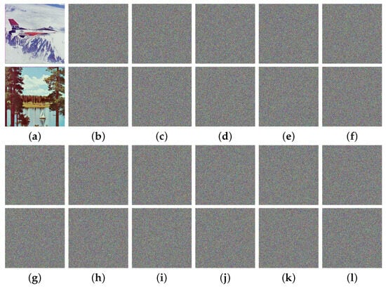For visual effects, a competent encryption algorithm should be able to entirely remove any meaningful information that can be perceived from the input image. On the other hand, the decrypted output image should fully restore all meaningful information. We conducted numerous tests on the MIEA-MPHM using randomly generated secret keys. In every test, the MIEA-MPHM could convert the input image into an unidentifiable noise image and restore the original image with no loss through decryption. Figure 9 shows the visual effects of our encryption and decryption tests. In the first encryption, six grayscale images (5.1.09, 5.1.10, 5.1.11, 5.1.12, 5.1.13, and 5.1.14) were encrypted simultaneously. In the second encryption, two color images (beeflowr and athens) were encrypted simultaneously. As can be seen, the ciphertext images generated by the MIEA-MPHM are entirely unrecognizable. Attackers cannot perceive any meaningful information from them. By utilizing the correct secret key, all authorized users can effortlessly obtain lossless decrypted images through decryption. Therefore, the visual effects of encryption and decryption provided by the MIEA-MPHM are in line with the requirements.