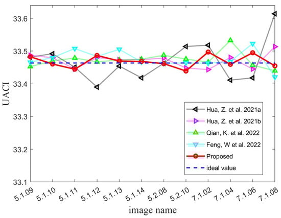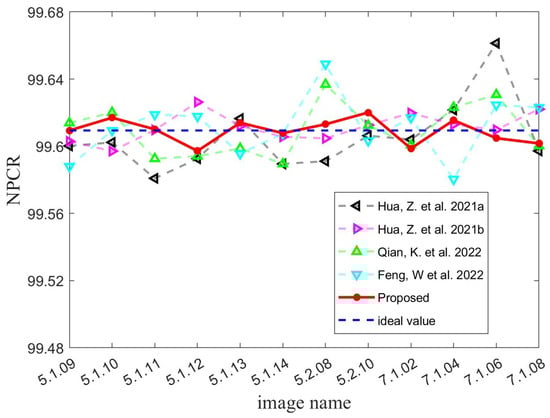 To showcase the MIEA-MPHM’s substantial advantages in encryption efficiency, we conducted comprehensive tests and compared its test results with those of six recent algorithms. By observing Table 6, we can find that the average encryption rate of the MIEA-MPHM is significantly higher than that of other algorithms. Among all of these algorithms, the average encryption rate of the MIEA-MPHM is nearly three times higher than the second-ranked algorithm and nearly eighty times higher than the slowest algorithm. To encrypt an image with a size of , the MIEA-MPHM only takes 0.1036 s on average, and its average encryption rate is as high as 87.2798 Mbps. Hence, when it comes to encryption efficiency, our proposed MIEA-MPHM offers greater practicality and can better fulfill the requirements of diverse practical applications.