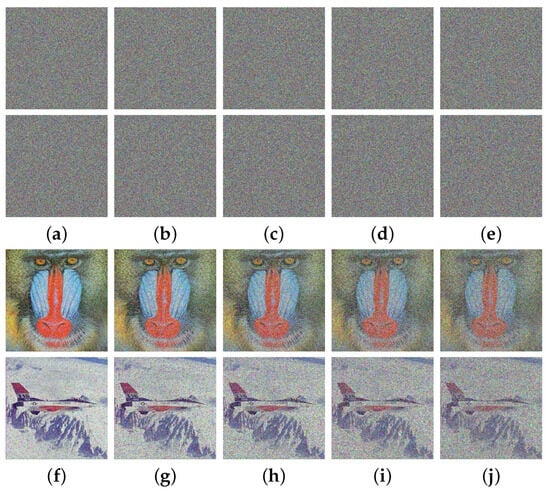 Robustness analysis on noise for MIEA-MPHM: (a) ciphertext images with salt-and-pepper noise of intensity 0.02; (b) noise of intensity 0.04; (c) noise of intensity 0.06; (d) noise of intensity 0.08; (e) noise of intensity 0.10; (f–j) are decrypted images of (a–e).