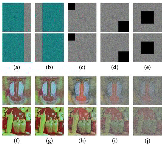 Robustness analysis on data loss for MIEA-MPHM: (a) pixels missing in red channel; (b) pixels missing in blue channel; (c) pixels missing in all channels; (d) pixels missing; (e) pixels missing; (f–j) are decrypted images of (a–e).