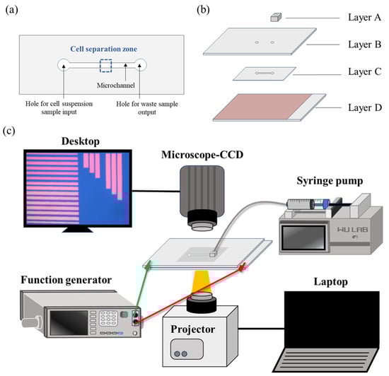 For the following assembly process, the Layer A was bonded with the Layer B via O2 plasma surface treatment. This was followed by the assembly with the Layer D via the Layer C (i.e., a double-sided adhesive tape). In terms of operation, a syringe pump (KDS LEGATO 180, KD Scientific, Holliston, MA, USA) was used to transport the cell suspension sample in the microchannel. For cell manipulation using ODEP, a function generator (AFG-2125, Good Will Instrument Co., Ltd., New Taipei City, NTPC, Taiwan) was used to generate an alternating current (AC) voltage between the two ITO glass substrates (Figure 1b). In the following step, a computer-controlled projector (EB-X05, Epson, Suwa, Japan) was used to illuminate dynamic light images onto the Layer D. In this work, the observation and recording of the cell manipulation process was achieved by using a CCD-equipped microscope (Zoom 160, OPTEM, Medina, OH, USA). The overall experimental setup is schematically illustrated in Figure 1c.