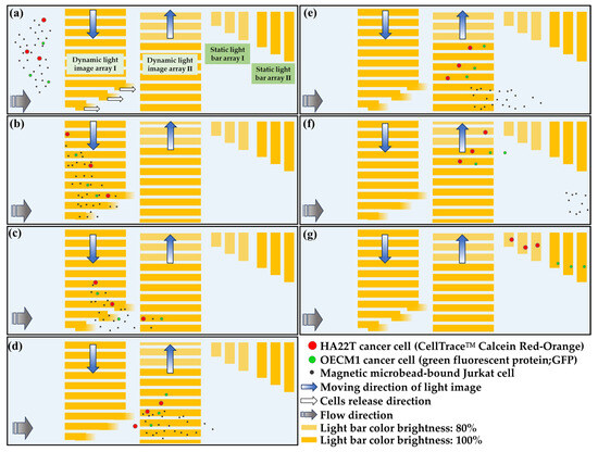 Schematic illustration of the entire ODEP manipulation process for the purification and sorting of cancer cells with different size: (a) the designed light image arrays including two dynamic light image arrays and two static light bar arrays (as indicated) in the cell separation zone of the microchannel (the color brightness is as indicated); (b,c): the dynamic light image array I was used to dynamically pool all cells, continuously transported to the cell separation zone, to one side of the microchannel; (c,d): the cells manipulated to the side of the microchannel were then released by the three light bars near the side of the microchannel in the flow direction; (d,e): the cells flowed to the dynamic light image array II were then sorted and separated by the ODEP manipulation, by which the magnetic microbeads-bound Jurkat cells could not be manipulated by ODEP and were thus released by the light bars near the side of the microchannel in the flow direction; (f,g): the cancer cells (i.e., the HA22T and OECM1 cancer cells) were manipulated by ODEP and thus were attracted and pulled to the another side of the microchannel. During this process, they were sorted and separated based on their size difference by the designed ODEP mechanism and then were collected by the downstream static light bar array I and II, respectively.