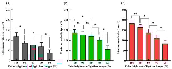 The relationship between the maximum velocities of light images that can manipulate the (a) magnetic microbeads-bound Jurkat (MB Jukat), (b) OECM1, and (c) HA22T cells under varied percentages (60, 70, 80, 90, 100%) of color brightness of light bar images. *: significant difference (p < 0.05) and ns: not significant.