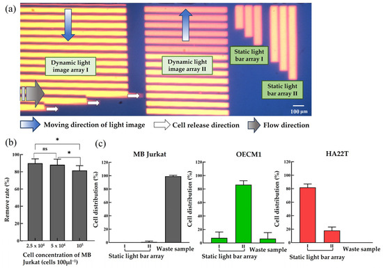 (a) The photograph of the designed light image arrays in the ODEP microfluidic system (a video clip was provided as the Video S1), (b) the performance (removal rate %) evaluation of the dynamic light image array I to manipulate the magnetic microbead-bound Jurkat cells to one side of the microchannel under different cell concentration conditions, (c) the distribution (%) of the magnetic microbeads-bound Jurkat (MB Jukat) (the left figure), OECM1 (the middle figure), and HA22T (the right figure) cells in the static light bar array I and II and in the waste sample after they were individually treated with the proposed ODEP manipulation scheme, as described in Figure 2. *: significant difference (p < 0.05) and ns: not significant.