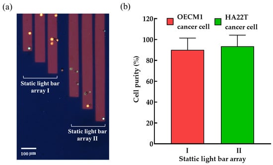 After the basic function tests as described above, the performance of the proposed ODEP microfluidic system for the purification and sorting of cancer cells with two different sizes was then evaluated. As described earlier, the ODEP microfluidic system was mainly designed to process the blood sample treated with the immunomagnetic beads-based cell separation for removing 99% of blood cells. Therefore, the main purpose of the ODEP microfluidic system was to (1) purify the cancer cells from the magnetic microbead-bound cells, and (2) further sort and separate the cancer cells with different sizes. For evaluating its working performance, the cell suspension tested, containing the magnetic microbead-bound Jurkat, HA22T, and OECM1 cells (ratio: 1:1:5) mimicking a blood sample processed with the immunomagnetic beads-based cell separation process, was prepared and then loaded into the ODEP microfluidic system. After the ODEP manipulation as described in Figure 2, the numbers of the three types of cells collected in the two static light bar arrays were quantified microscopically. For identifying the cell species, HA22T and OECM1 cancer cells were pre-stained with CellTrace™ Calcein Red-Orange (C34851, Invitrogen, Carlsbad, CA, USA) or expressed with GFP (green fluorescent protein), respectively. After that, the purity of the two cancer cells collected in the two static light image arrays was then evaluated.