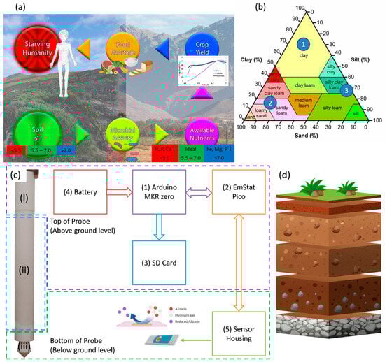 (a) How soil pH affects humanity. (b) The soil texture triangle provides a breakdown of the different soil types, where the numbers indicate the 3 chosen soil types for sensor calibration. (c) Block diagram illustrating the hardware and probe used in this study showing the (i) top, (ii) middle, and (iii) bottom parts. (d) A simple breakdown of the change in soil composition at various depths.