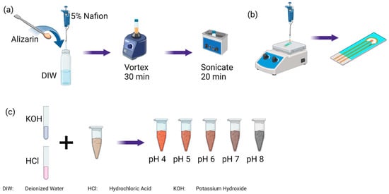 To prepare the pH-sensitive coating, 5 mg of alizarin was mixed with 950 μL of deionized water, as illustrated in Figure 2a. Then, 50 μL of 5% Nafion 117 was added to the solution and mechanically stirred for 30 min followed by a sonic bath for 20 min. The mixture was then mechanically stirred for 30 s before the preparation of every electrode. An amount of 20 μL was pipetted onto the working electrode at 110 °C drop by drop. The sensor was left on a hot plate at 110 °C for 20 min followed by 2 min off the hot plate to cool down to room temperature.