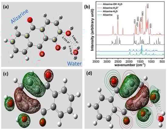 (a) Computational analysis of alizarin–water interaction shows strong H-bonded interaction. (b) Theoretical FTIR absorption spectra of alizarine with protonated and hydroxylated water molecule to justify the effect of pH. (c) HOMO electron cloud representation of alizarin. (d) HOMO–LUMO combined orbital configuration of alizarin, upon interaction with water molecule, shows significant tilt of electron cloud towards water molecule.