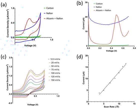 The effect of each layer in the sensor stack was studied by running cyclic voltammetry on three different sensors: a bare carbon sensor, a carbon sensor coated with 0.5% Nafion diluted in deionized water, and a carbon sensor coated with the Nafion and alizarin mixture. The sensors were coated with 10 mg of sandy loam soil slurry at pH 7 and incubated for 10 min. Cyclic voltammetry (CV) and squarewave voltammetry (SWV) demonstrate that the oxidation peak is due to the alizarin only, shown in Figure 4a,b, respectively. Figure 4c shows cyclic voltammetry recorded with varying scan rates ranging from 12.5 mV/s to 150 mV/s using the proposed sensor with the full Nafion and alizarin coating. Figure 4d shows the peak current measured from the baseline indicated in Figure 4c plotted against the square root of the scan rate. The presented linear relationship is in accordance with the Randles–Sevcik Equation (3), which depicts diffusion-controlled mass transfer [].