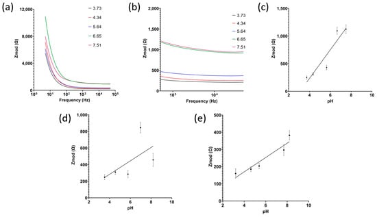 The redox charge transfer process of alizarin in the presence of H+ ions was captured using electrochemical impedance spectroscopy (EIS). As pH increases, hydrogen ion concentration decreases, thus impedance increases. For each soil type, three different sensors were used to measure the impedance. The samples were incubated on the sensor for 10 min before the measurements. All plots and reported results show the mean and standard deviation. For clay soil, this behavior can be seen in Figure 5a–e, with the sensor having a sensitivity of 258.5 Ω/pH and R2 = 0.8686 for pH range 3–9. Similarly, loamy clay soil showed a linear relationship between impedance and pH, with a sensitivity of 30.5 Ω/pH and R2 = 0.8449.