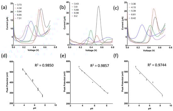 In the following study, squarewave voltammetry was used to measure the pH of the soil samples rather than EIS due to its higher sensitivity to faradaic current. Figure 4a,b confirm that the oxidation peak is due to the presence of alizarin in the coating and not produced by the carbon electrode or the Nafion matrix. The sharpness of the peak is attributed to the fact that squarewave voltammetry rejects capacitive current, and soil is capacitive in nature. Following that, the detection of pH in the three different soil types is shown in Figure 6a–c, showing a negative shift in the peak potential as pH increases, while the resultant linear model is shown in Figure 6d–f. The theoretical peak potential should vary by −59 mV/pH according to the Nernst equation at 25 C. As shown in Figure 6d–f, the sensor’s sensitivity varies between the different soils from −50 mV/pH up to −66 mV/pH, hovering close to the theoretical value of −59 mV/pH.