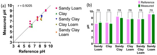 The samples measured by the sensors had their water content adjusted to 10–40% of the sample’s weight, mimicking agriculture conditions. All measurements were performed using three different sensors (n = 3). Figure 7a shows Pearson correlation analysis between all the measured pH values using the proposed sensor system plotted on the y-axis and the reference glass electrode pH values plotted on the x-axis, showing a Pearson r of 0.9205. Figure 7b shows the two-way ANOVA between the reference pH and measured pH for the various soil textures.