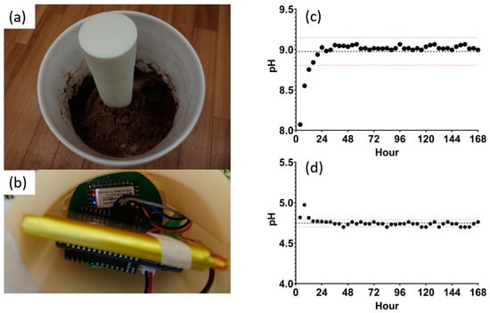 (a) Probe setup in the 19 L bucket and (b) the hardware housed at the top of the probe. (c) Measured pH over 7 days in sandy loam soil and (d) measured pH over 7 days in clay sandy soil with the mean and standard deviation lines drawn.