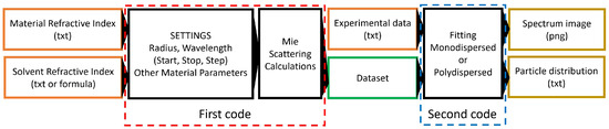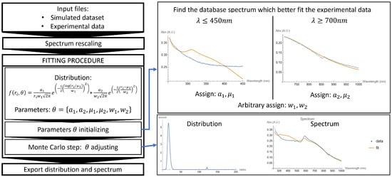 The second code comes in two versions: one is for monosdispersed NPs colloidal solution (Mono_Fitting.nb) and the other is for polydispersed ones (Poly_Fitting.nb algorithm presented in Figure 2). Firstly, both the experimental data and cross section from the dataset are acquired. The experimental data are usually reported in arbitrary units, and the computed cross sections present values of the order of magnitude less than . Working with these values is computationally inconvenient; for this reason, they will be rescaled. The total absorption spectrum of a given particle distribution is obtained by integrating over the full particle radius in the range, but when computed, the integral must be discretized: